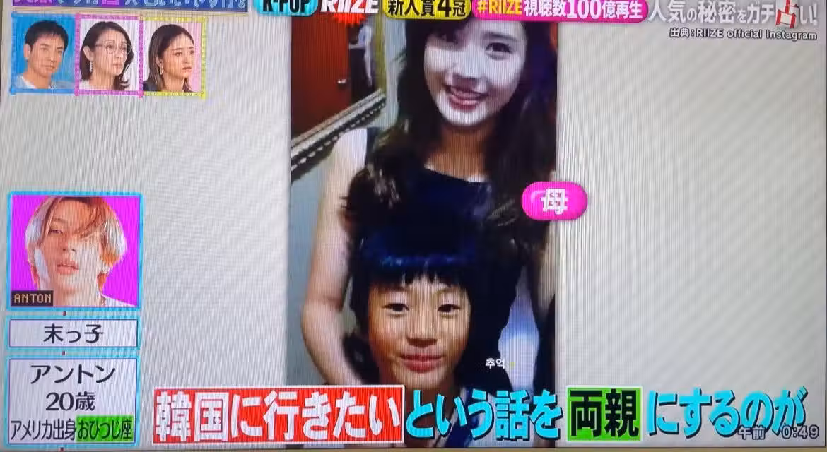 Anton的父親是知名音樂人尹尚,媽媽是韓國演員沈惠珍,Anton從小就因為星二代身份認識了不少演藝圈名人;此次日本綜藝節目曝光的照片正是過去Anton公開過的照片,當時他PO出與IU的合照表示:「姐姐!!我會一直支持你的!!很高興能以RIIZE的Anton的身份見到你~~剩下的H.E.R.的巡演也要加油!今後也是」,畫面中Anton身高還只到IU的胸前,兩人模樣都非常稚嫩。