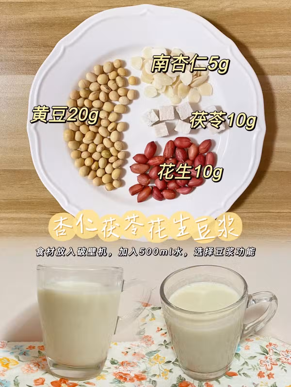 黃豆20g、南杏仁5g、茯苓10g、花生10g+清水500ml