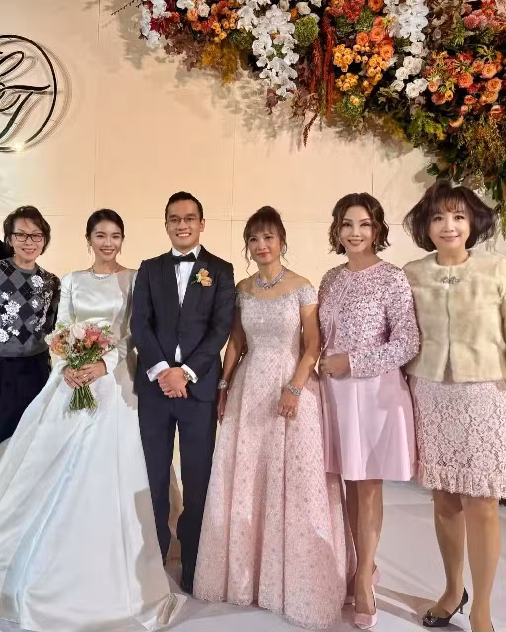 謝玲玲又分享與一對新人合照以及婚宴場內盛況,照片中所見,穿上一襲簡約款式的長袖婚紗配襯鑽石耳環和頸鏈的Tina Huang,外貌長得秀氣優雅,與新郎鄭志亮郎才女貌、天生一對。