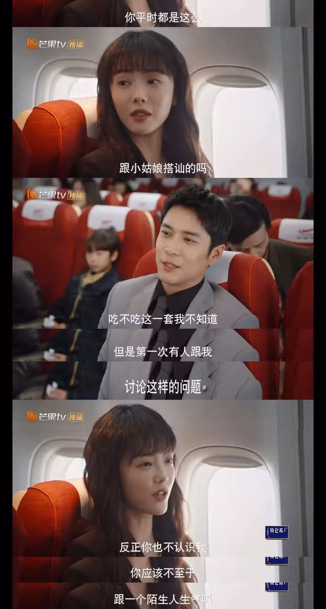 一如唐影所說,飛機上的陌生人,誰也不會刻意記住彼此。雖然兩個人禮貌性地握過手,互相告知對方名字,下飛機後,唐影手機沒電,許子詮還借了她一塊充電寶。但後面的劇情里可以看出,許子詮確實對唐影轉臉就忘。直到一天晚上,唐影在上司的生日宴上喝醉,又被大老闆緊急叫回寫字樓加班,進樓門時醉醺醺地衝著保安出示充電寶。剛好出寫字樓的許子詮第一眼認出的是自己的充電寶,才開始在記憶里搜尋這個姑娘。
