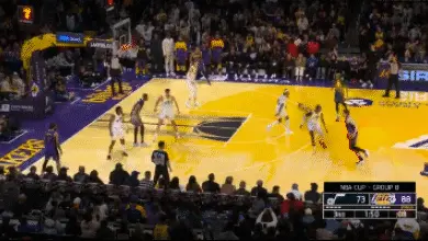 接到拉塞爾傳球後克內克特通過不斷運球來找節奏,最終在左側45度角迎著爵士防守球員完成持投三分。