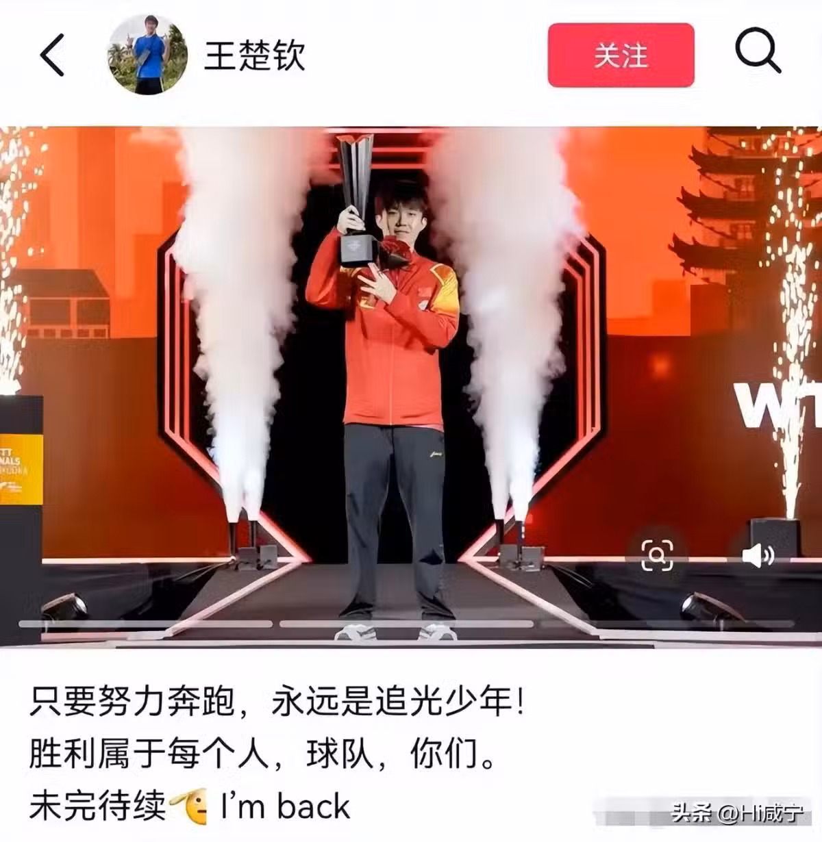 他的正手抽殺力量驚人,球拍與球碰撞的瞬間,發出清脆的聲響,球如閃電般划過球檯,令觀眾們不禁為之驚嘆。反手推擋也是穩健有力,一次次成功地化解了對手的進攻。在一次精彩的回合中,張本智和發起了猛烈的進攻,球如連珠炮般向王楚欽飛來。王楚欽不慌不忙,他用敏銳的眼神洞察著球的軌跡,身體迅速做出反應,左右來回移動,用精準的反手推擋將球一一回擊。幾個回合下來,張本智和漸漸露出疲態,而王楚欽則越戰越勇。最終,王楚欽以 4 - 0 的壓倒性比分戰勝了張本智和,成功衛冕全球乒聯福岡總決賽的男單冠軍。那一刻,整個球館都沸騰了,觀眾們的歡呼聲、掌聲如雷鳴般響起,王楚欽高高舉起雙臂,臉上洋溢著勝利的喜悅與自豪。
