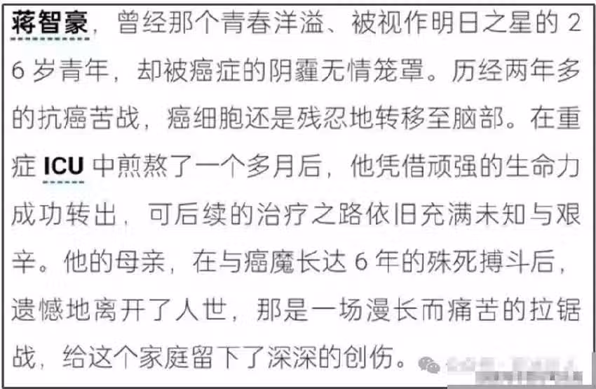 兩年後,病魔的陰影再次降臨,這一次的受害者是母親的兒子,蔣智豪。