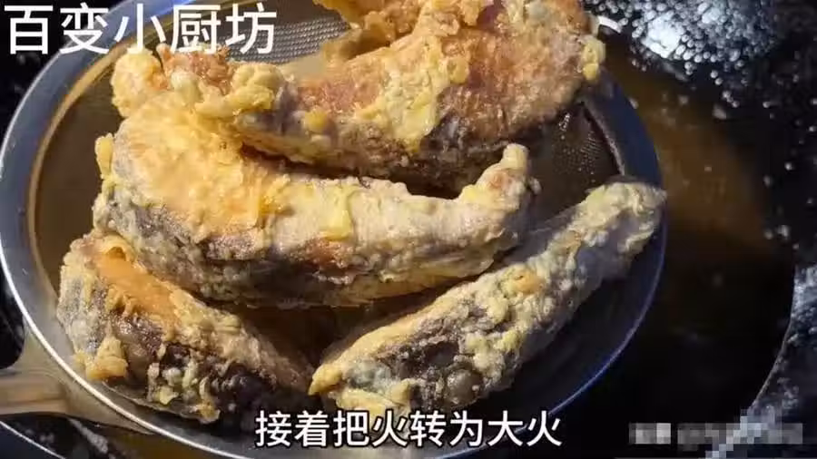整個炸的過程中沒有任何技巧與難度,只需要耐住性子不停的翻動魚塊,如果一時不翻動,很容易就把魚塊炸糊了,而裡面還是生的。