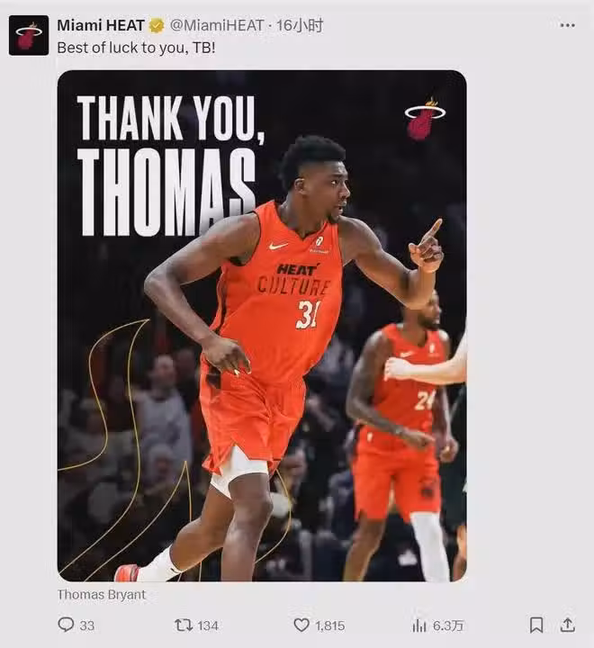 還記得托馬斯-布萊恩特嗎?他又被交易了!熱火官方宣布:將托馬斯-布萊恩特送至步行者,換來一個2031年的次輪互換權。你沒看錯,托布連一個次輪簽都換不來,只能換一個「次輪互換權」。他在步行者首秀3中3,拿到7分2板1帽。