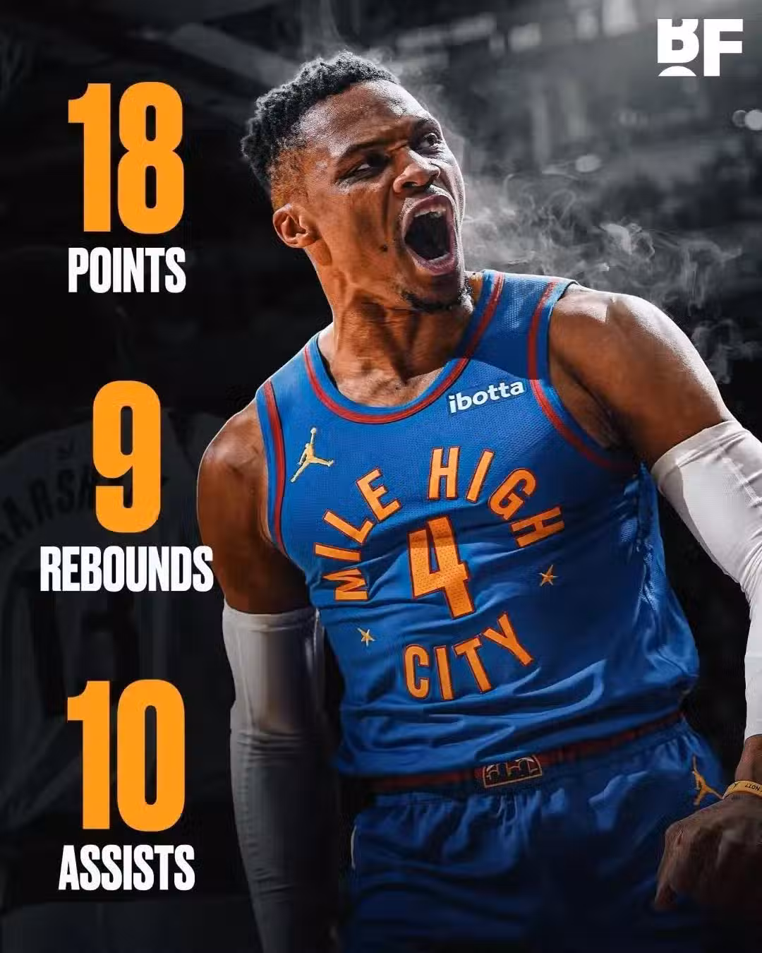 威少本賽季出戰24場首發6次,而他首發期間,場均能得到14.8分5.8板8.7助2.7斷,投籃命中率高達54.1%,掘金更是5勝1負。