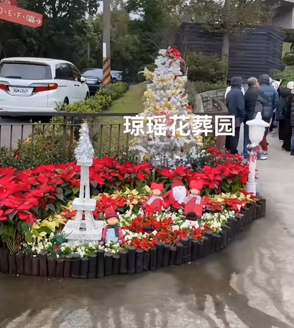 瓊瑤離世15天,墓園悼念人群仍舊排長龍,墓地入口擺著聖誕鮮花