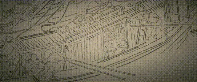 再仔細看畫,梅船過河之時,船工都在手忙腳亂放桅杆,為何船艙中,還有四人?