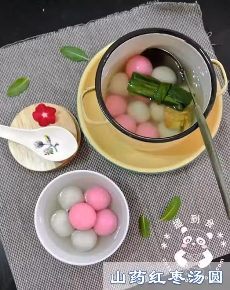 材料:(可作18-20粒湯圓)糯米粉 100g,熟山藥泥 100g,冷水 60g,紅棗泥 120g,班蘭葉 數片,姜 1塊拍爛,白砂糖 適量,紅色素 少許(可不用)
