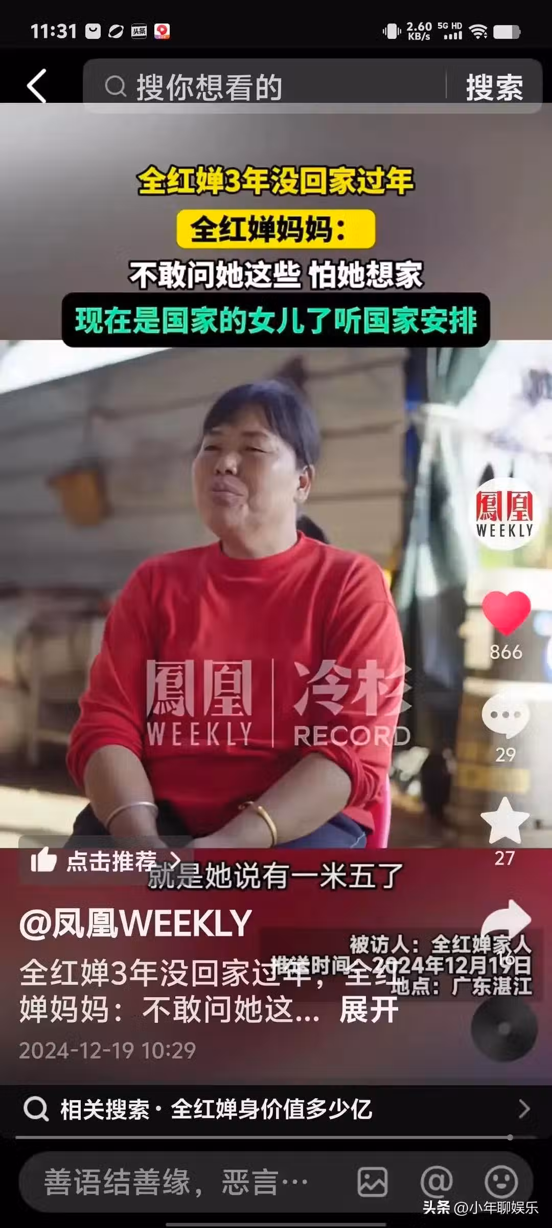 全紅嬋的老媽還表示,全紅嬋現在是國家的女兒,聽國家的安排。