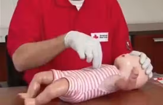 將孩子臉朝上放在堅實的平面上。將兩或三根手指放在孩子乳頭下的胸部中央,以每分鐘至少100次的速度進行30次輕柔的胸部按壓。每次胸骨下陷深度要達到約1.5英寸(合3.8厘米)。