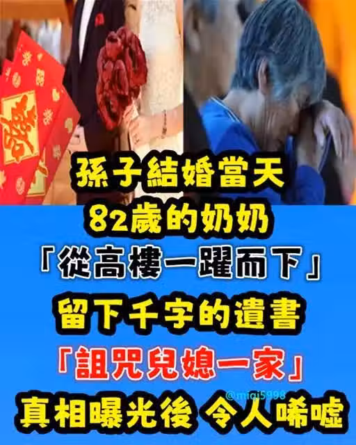 孫子結婚當天!82歲奶奶「從高.樓一躍.而下」 留千字遺書「詛.咒兒媳一家」真相曝光後:令人唏噓