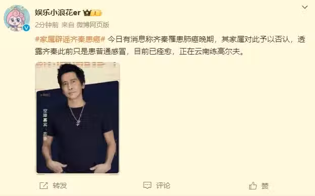 相關輿論發酵之後,齊秦的家人出面闢謠,並透露齊秦只是患有普通的感冒,目前已經痊癒,正在雲南練高爾夫球。