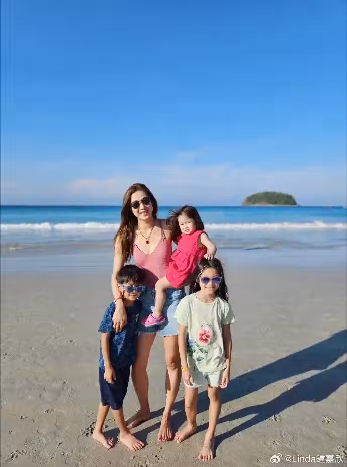 在母子母女四人的正面照里,鍾嘉欣仍然輕鬆單手抱著三胎女兒,她臉上露出十分陽光明媚的笑容,穿著粉色弔帶衫美炸屏啦。媽媽懷裡的小公主披著長長的頭髮,穿著玫紅色小裙子,可愛爆棚。大寶和二寶則分別戴著墨鏡,姐弟倆一個靠著媽咪,一個則站在妹妹前面,並且還任由妹妹的手放在自己的頭上,妥妥地「妹控」。