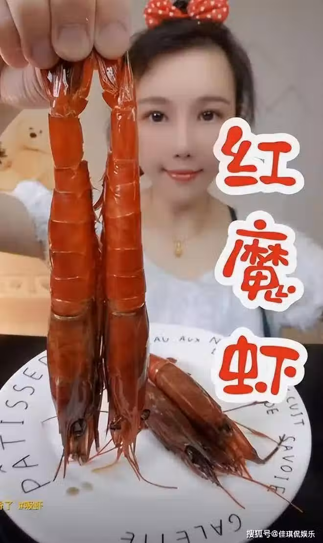 第一條視頻中的她,溫柔的剝開紅魔蝦的腦袋,將黃色的蝦腦一股腦吸在嘴巴里。