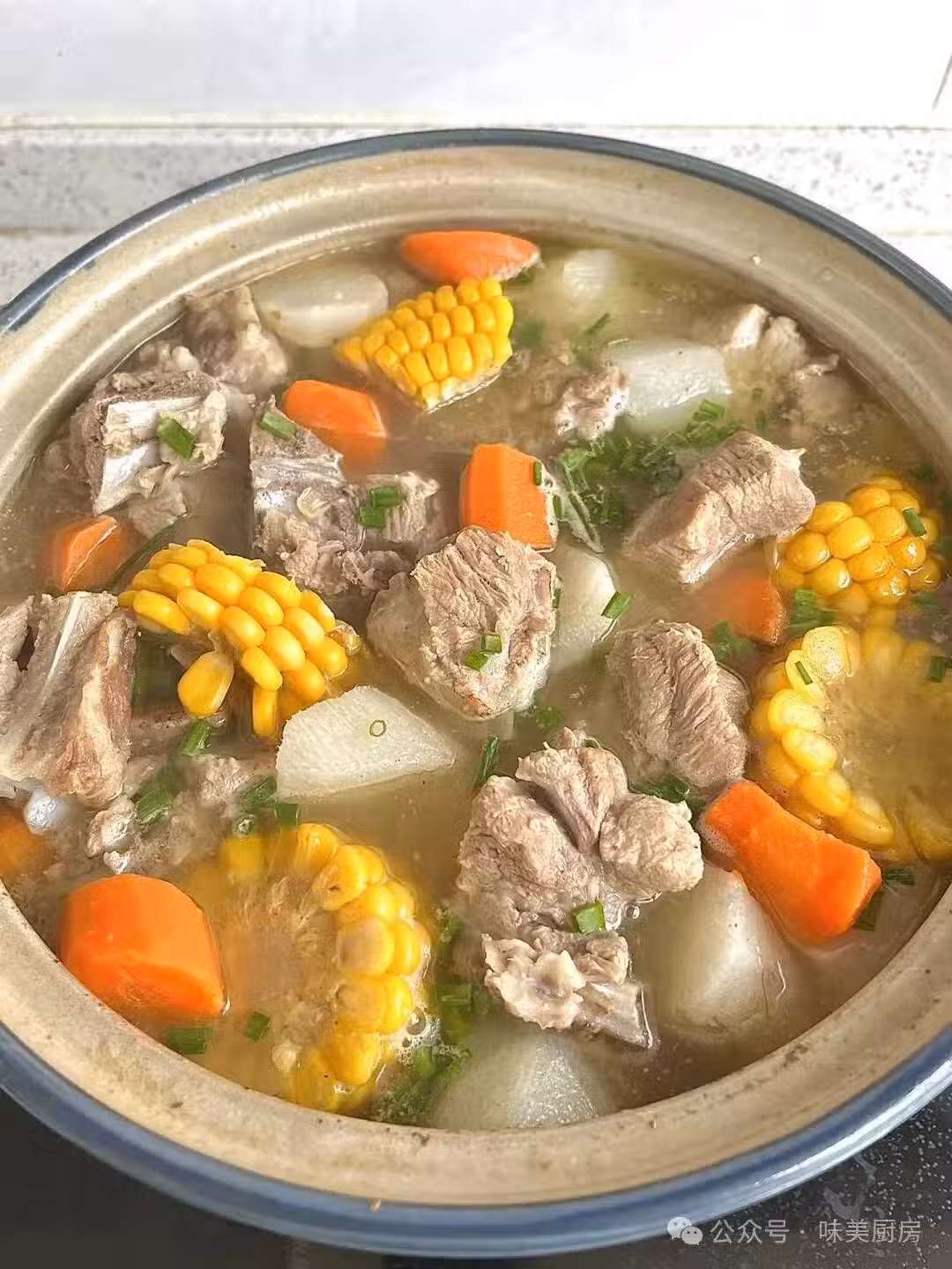 食材: 排骨、水果玉米、胡蘿蔔、山藥、蔥姜、鹽、雞精