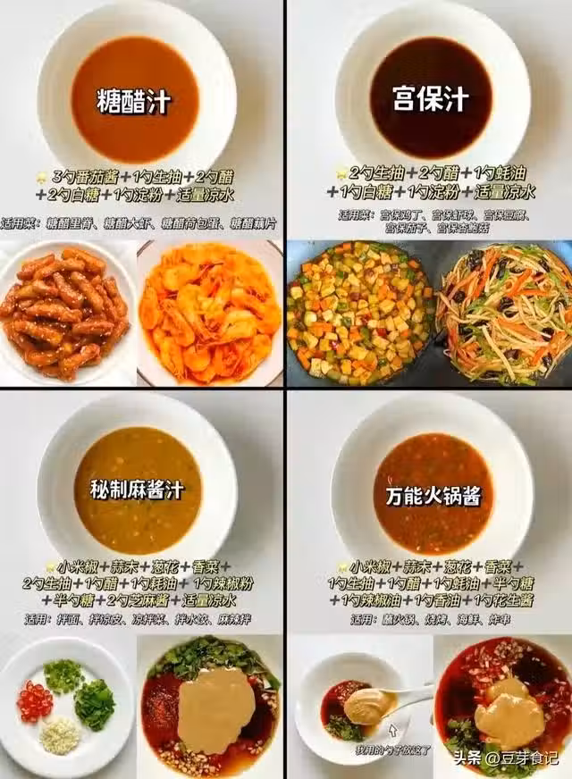 魚香汁:生抽+醋+蚝油+白糖+澱粉 黑椒汁:生抽+老抽+蚝油+黑胡椒粉+澱粉 照燒汁:料酒+生抽+老抽+蜂蜜