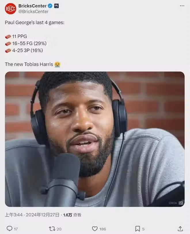 媒體BricksCenter曬出喬治過去4場數據:場均11分;投籃合計55中16,命中率29%;三分合計25中4,命中率16%。該媒體調侃喬治:「新版托拜亞斯-哈里斯。」76人主帥納斯說:「我覺得喬治投籃選擇很棒,雖然沒進,我也很滿意。」