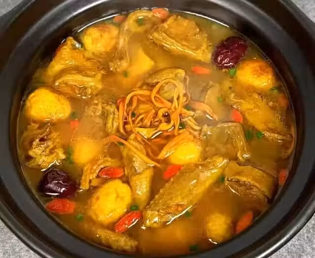 食材:乳鴿1隻、蟲草花、黃芪、枸杞適量、熟鵪鶉蛋15個