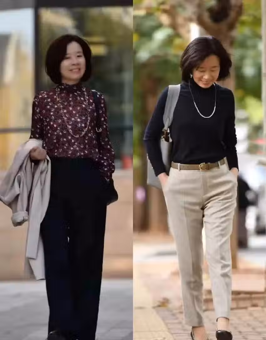我們可以巧妙將紅色高領衫的衣擺塞進卡布里褲的褲腰裡,有效勾勒出中年女人纖細的腰部輪廓,完美優化了中年女人全身的穿搭比例。