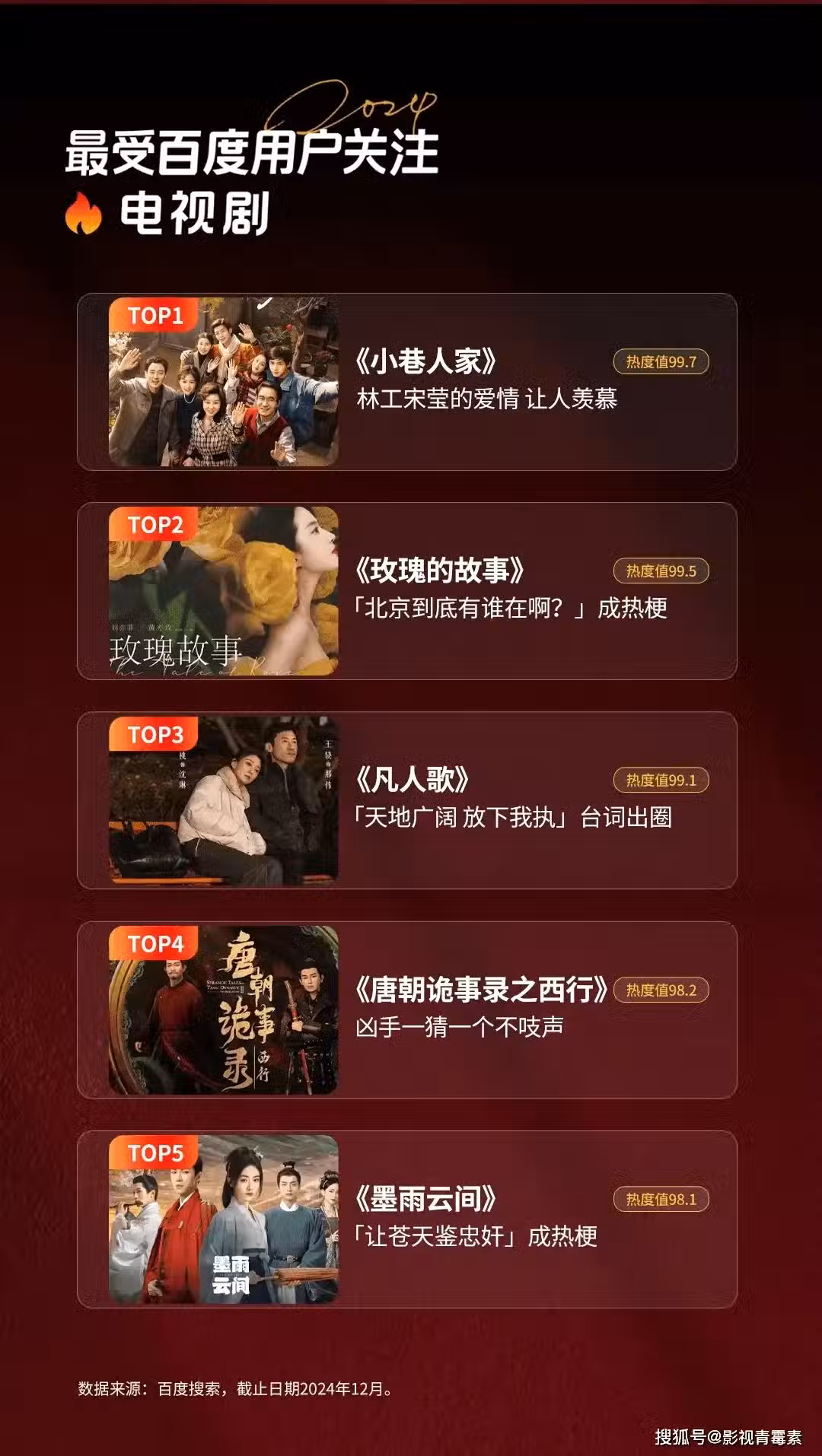 百度發布《2024百度熱搜年度報告》,2024年最受百度用戶關注的電視劇有五部:
