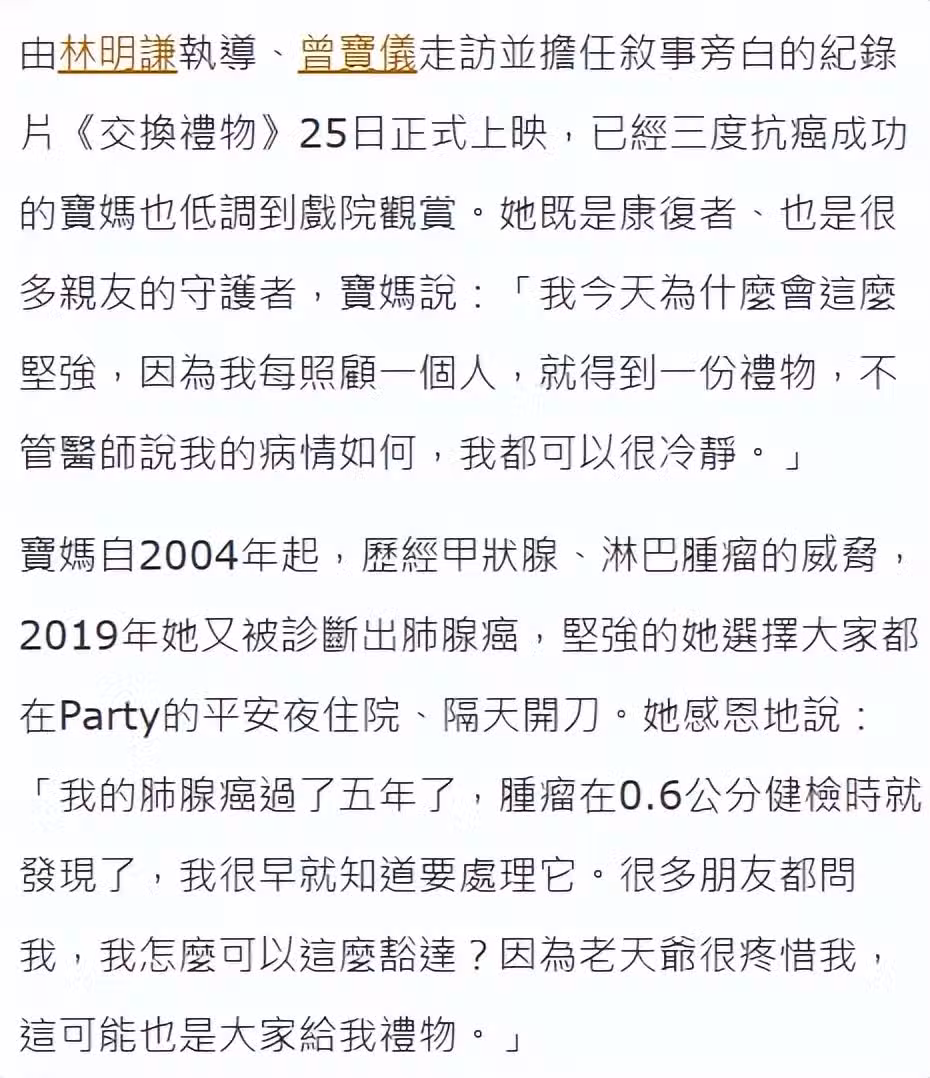 王美華她近日現身觀看女兒的新電影《交換禮物》,該片主要記錄癌症病人以及家人的心路歷程,王美華以康復者的身份表示「我今天為什麼會這麼堅強,因為我每照顧一個人,就得到一份禮物,不管醫師說我的病情如何,我都可以很冷靜。」