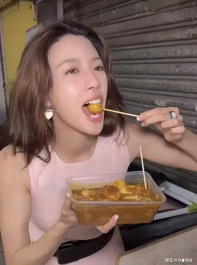 TVB視後蔡思貝吃路邊攤,打扮清涼笑容迷人,大口吃魚蛋接地氣