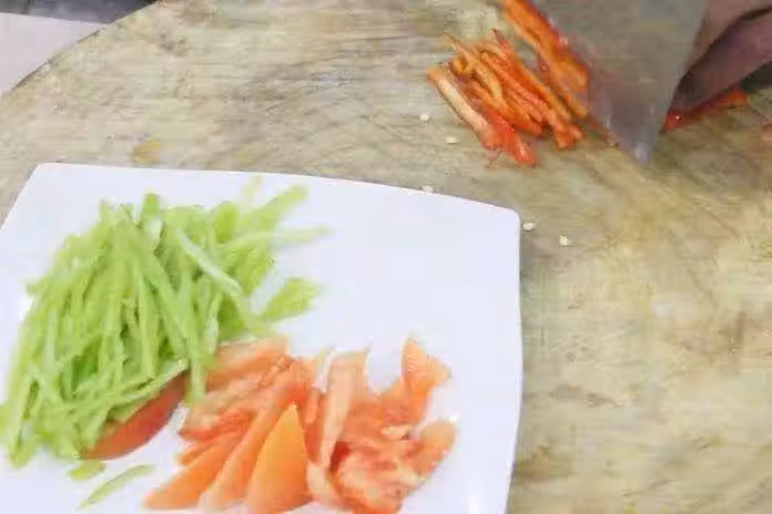 2.鍋里燒水,加入少量白醋防止茄子氧化變黑,水開後把茄子倒入鍋內焯水1分鐘,然後撈出茄子,控干水分。