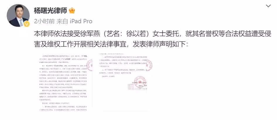 律師聲明稱: 「徐軍燕(藝名:徐以若)女士『毆打』趙露思女士、索要『天價解約金』為不實信息。」