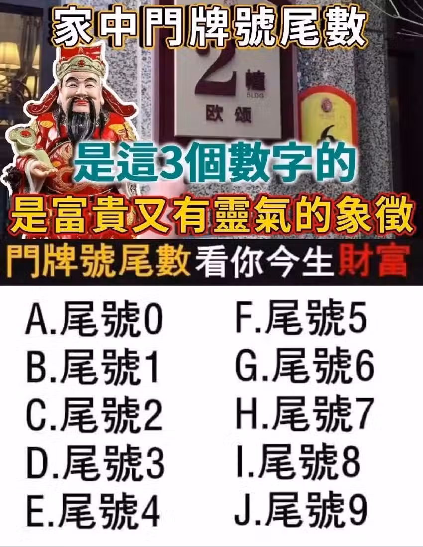 戶門適宜朝東、朝東北、朝西北、朝西南,樓層或門牌號碼尾數適宜是3、4、8、1。