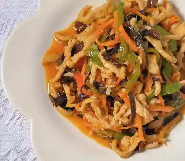 食材:裡脊肉絲、胡蘿蔔絲、木耳絲、彩椒