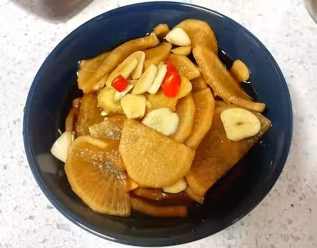 食材:兩根白蘿蔔、一小根胡蘿蔔、一頭半的蒜、10根小米辣(根據自己喜辣程度)少許薑片
