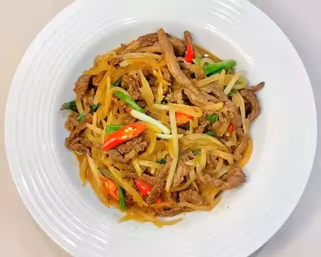 2、牛肉切絲放生抽、老抽、料酒、澱粉腌制十分鐘
