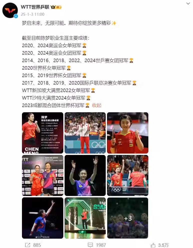 世界乒聯連續3天發文,先後向馬龍、陳夢、樊振東送上新年祝福**
