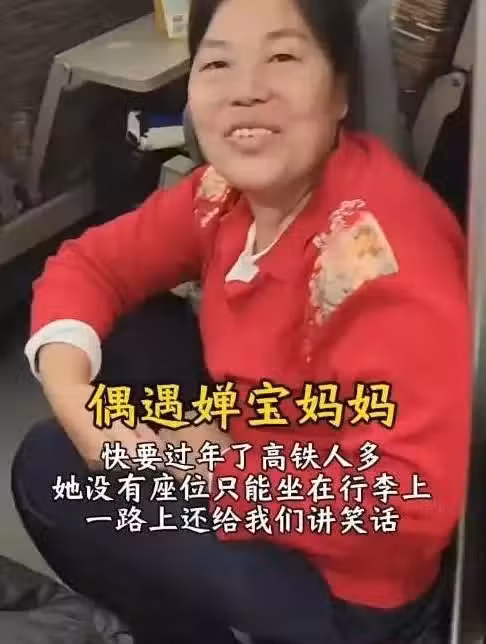 全媽媽去看望兒子,坐高鐵沒搶到有座票,坐在行李袋上仍笑容滿面**