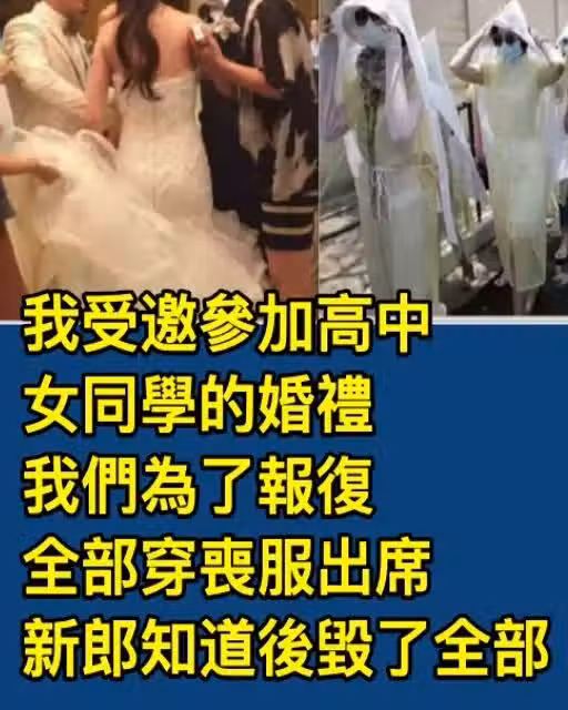 我受邀參加高中女同學的婚禮,我們為了報復全部穿喪服出席,新郎知道後毀了全部