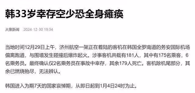 2024年12月29日9時7分左右,一架從泰國曼谷飛往韓國務安的濟州航空7C2216次航班,在韓國務安國際機場著陸時,起落架沒有放出,飛機機腹著地,衝出跑道,以極快的速度撞上機場圍欄外牆,隨後客機爆炸起火。