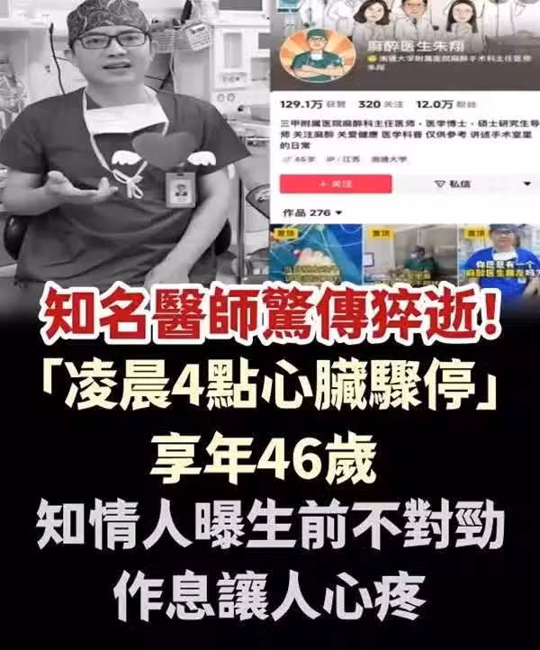 知名網紅醫生朱翔驚傳離世,消息震驚陸網,同事悲痛證實噩耗並曝光死因。