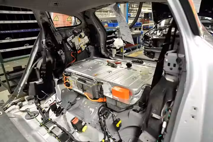 舊款 V60 PHEV 搭載的 111.8 kWh 鋰電池組放在行李箱底板 ,圖為原廠 2013 V60 Plug-in Hybrid 產線圖。