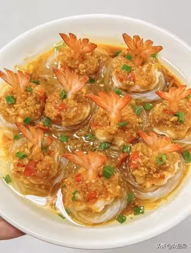 3. 將泡軟的粉絲放在盤底,擺上處理好的鮮蝦,淋上蒜蓉醬,水開後蒸 5 - 8 分鐘,出鍋撒蔥花,淋熱油。這道菜寓意著「紅紅火火」,為新年增添喜慶氛圍。