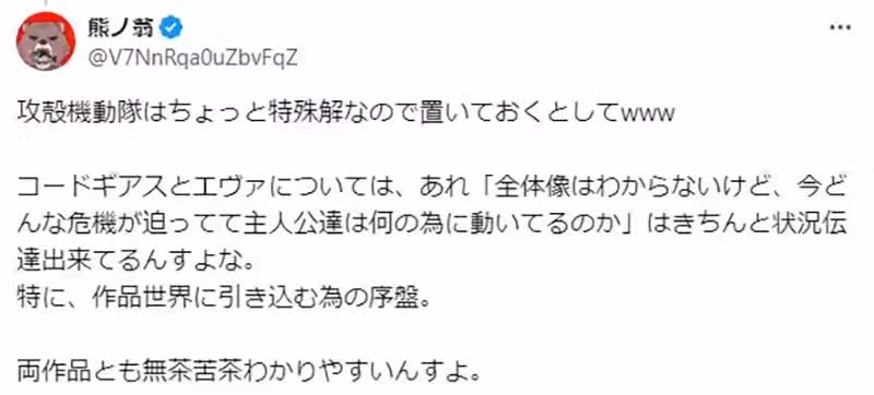「反過來說,很多世界系作品會失敗,至少都有一部分是因為這方面解釋不清。『謎團一個接著一個』這種事情本身雖然不是壞事,也的確能夠提升作品的魅力。然而要是沒辦法讓讀者明白『現在面臨著什麼危機』的話,也沒辦法傳達謎團的魅力了。」