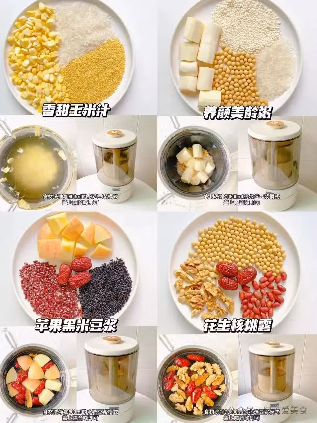 蘋果黑米豆漿,蘋果的香甜多汁搭配黑米還有紅豆和紅棗味道融合的很好,既不會很甜也不會很酸很適合,不怎麼愛喝甜的朋友們喝。也會有股非常清爽的味道! 香甜玉米汁,玉米的味道非常的香甜多汁,再搭配上大米和小黃米味道又豐富起來了。特別適合大家當早餐喝。