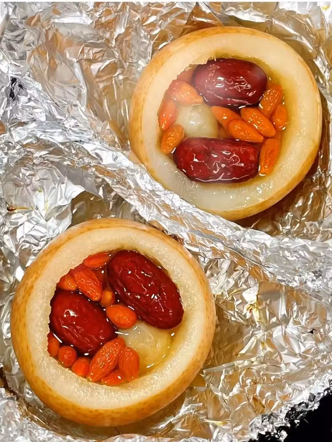 將紅棗、銀耳、桂圓、枸杞和雪梨一起烤制,味道香甜滋潤,喉嚨立刻就感覺舒服多了,這個方法特別適合熱咳時使用!