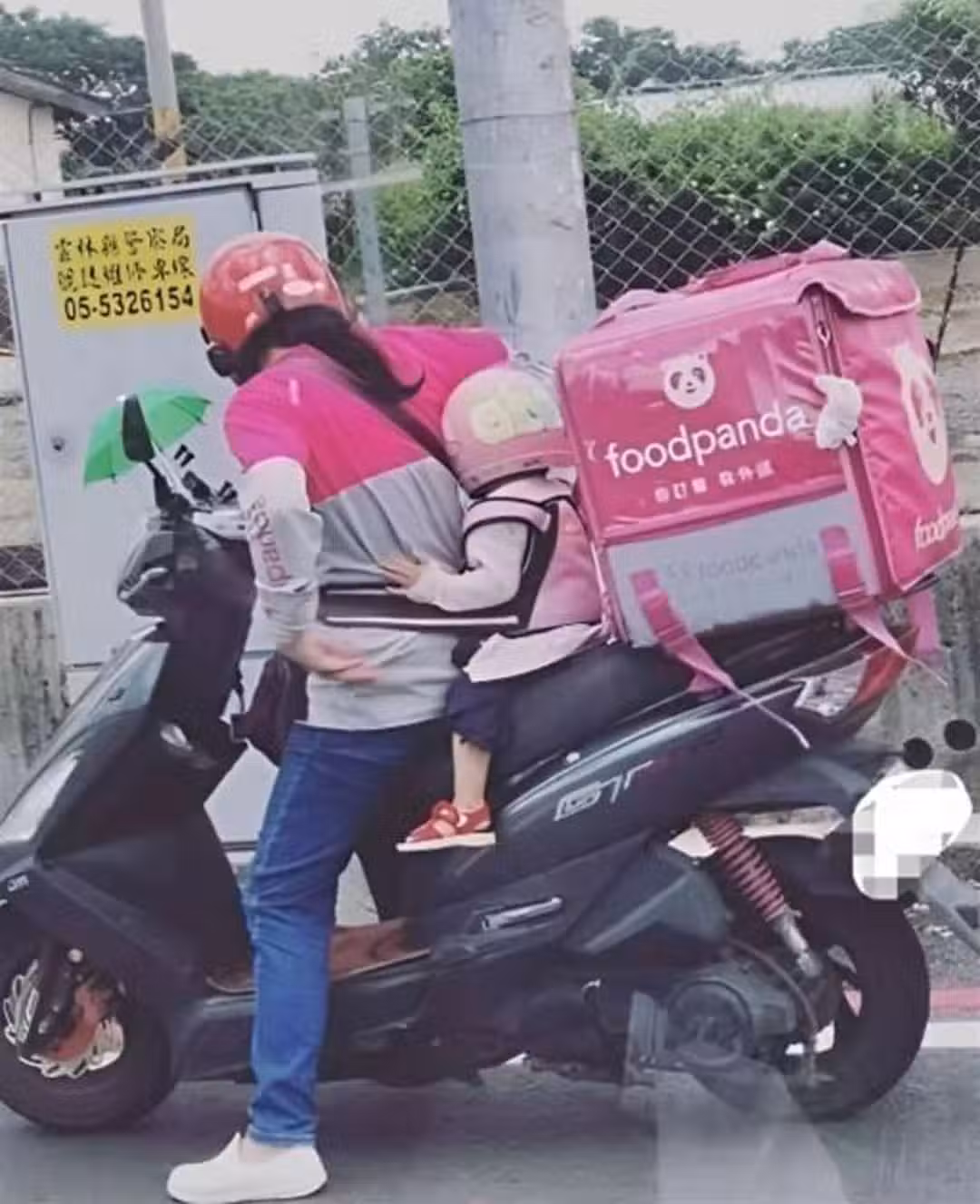 據ETtoday新聞雲報導,有民眾在路邊拍到一名年輕媽媽,在大熱天把女兒綁在背在後面騎著機車外送。