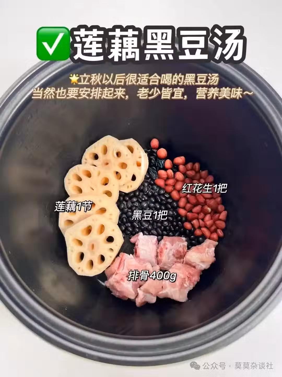 黑豆提前泡4小時,紅花生洗凈,蓮藕切塊。