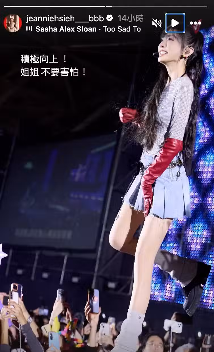 至於謝金燕方面,雖未對此事作出回復,但仍在限時動態中上傳一張表演照片,配上歌手莎夏斯隆(Sasha Sloan)的歌曲《Too Sad To Cry》(欲哭無淚),簡短寫下,「積極向上,姐姐不要害怕!」,也被解讀為對利菁此番言論的回應。