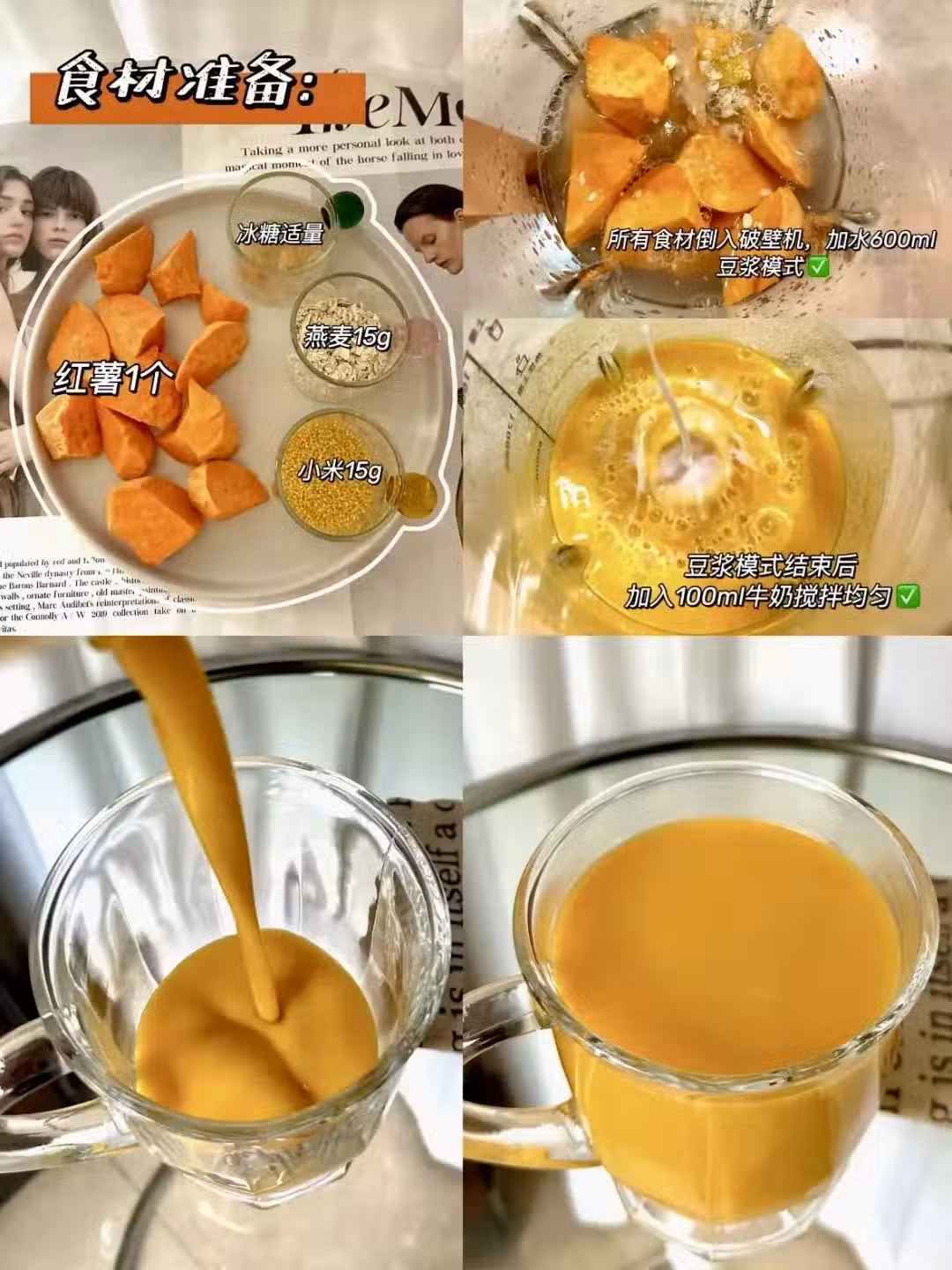 • 豆漿模式結束後,倒入 100ml 牛奶,再次攪拌均勻,一碗熱氣騰騰、香氣撲鼻的紅薯燕麥小米糊就做好了。無論是作為早餐還是下午茶,都是滋養身體、養肝補氣的絕佳選擇。