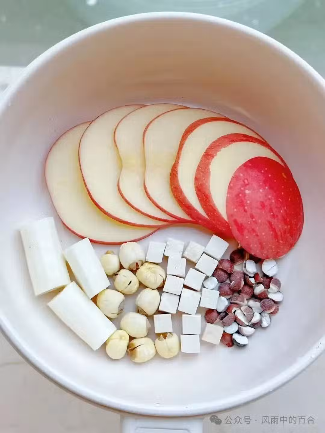做法:蘋果1個洗凈切片,茯苓10g,蓮子10g,芡實10g、淮山10g,加入800ml清水煮30分鐘。