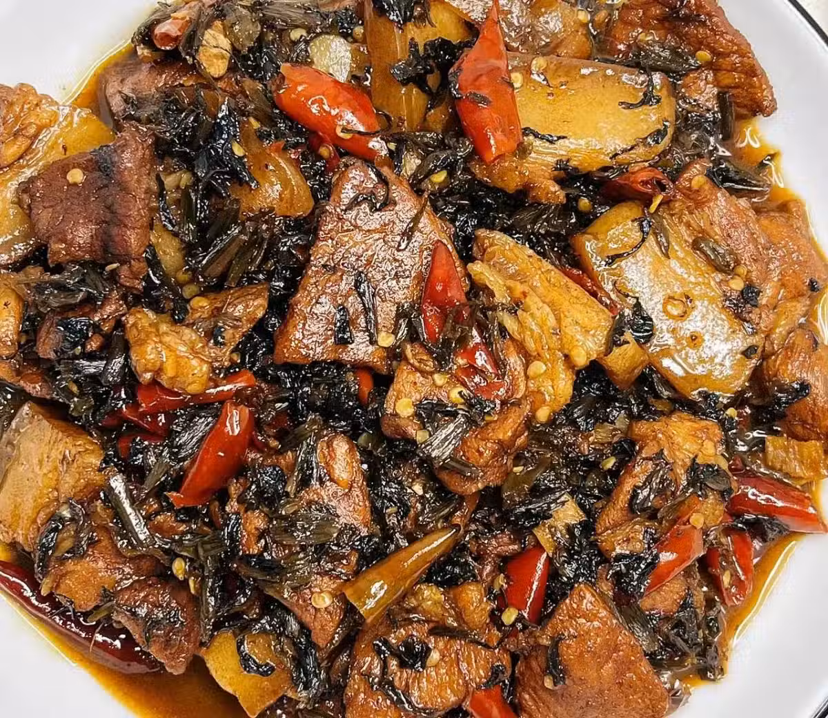 3、鍋燒熱無油,倒入洗乾淨的梅乾菜炒干水分炒香盛出,鍋中少油,姜蒜辣椒爆香,倒入豬蹄,把豬蹄回一個鍋,調味加點鹽,生抽➕蚝油➕胡椒粉➕雞精➕一勺辣椒麵,倒入梅乾菜翻炒均勻,接著倒入壓豬蹄的原湯繼續燜煮3分鐘,出鍋前加蔥或蒜葉即可