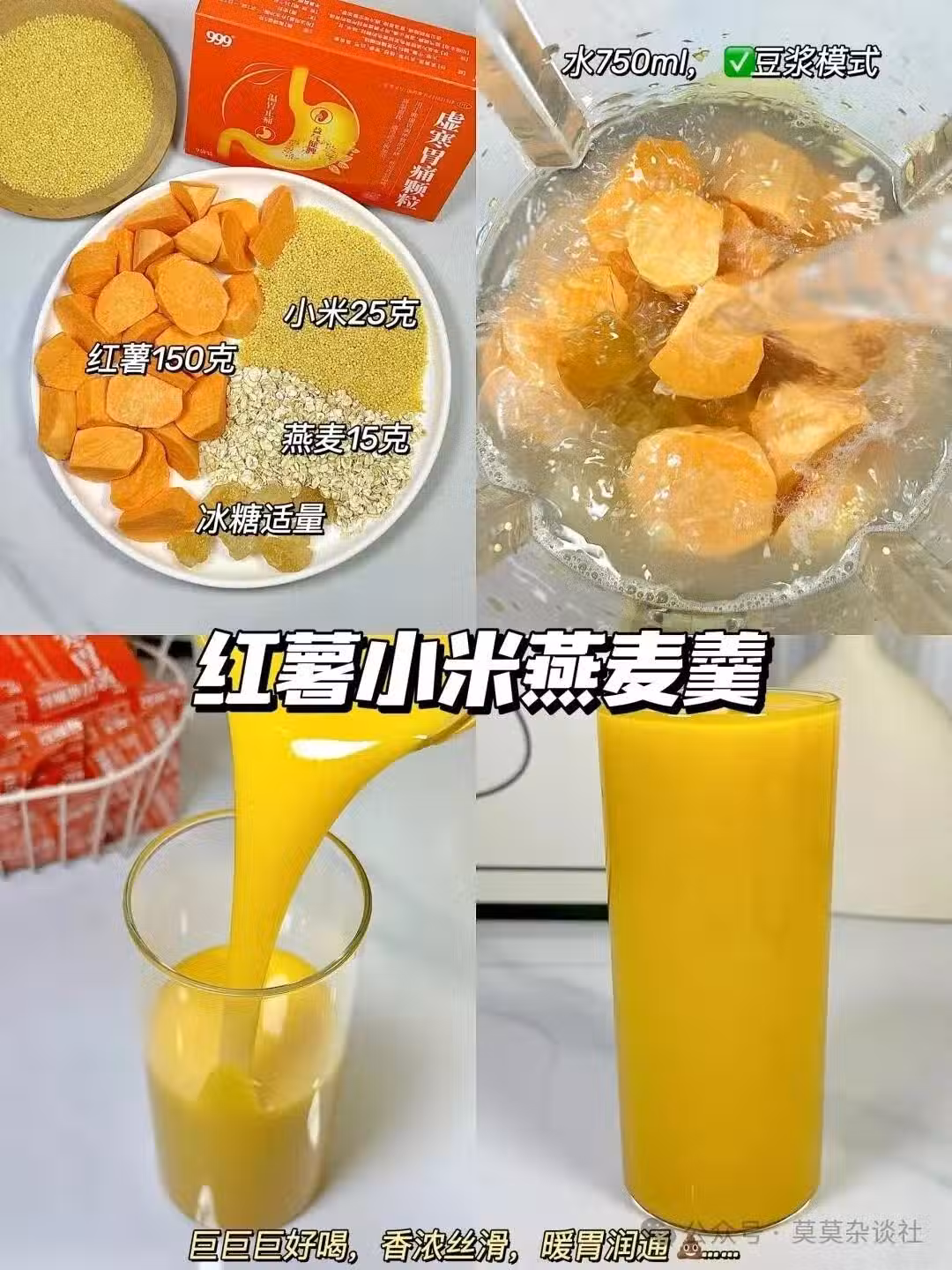 紅薯健脾胃、小米養胃、燕麥潤腸道,喝下去暖暖的。如果你的腸胃有點兒「慢性子」,它會幫你「通一通」。
